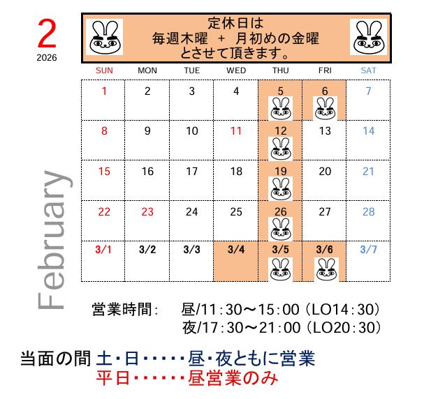 2026年2月のカレンダーは 下記の通りです。